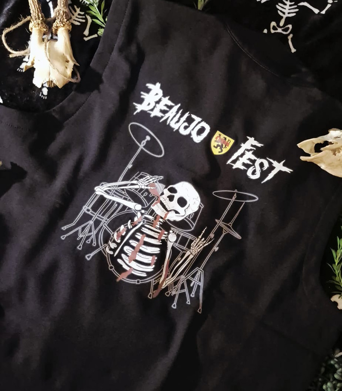 Au dos, un squelette batteur en pleine énergie, entouré de sa batterie détaillée, apporte un look percutant et décalé. Le logo Beaujo’Fest trône au-dessus, imprimé avec une finition nette et résistante, fidèle aux couleurs du festival.